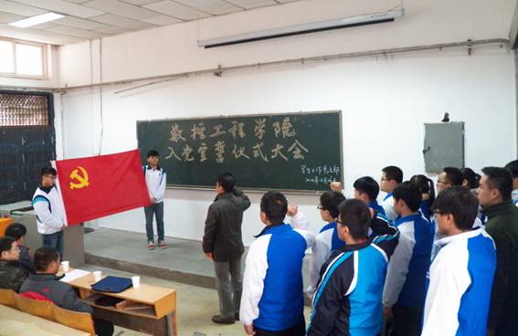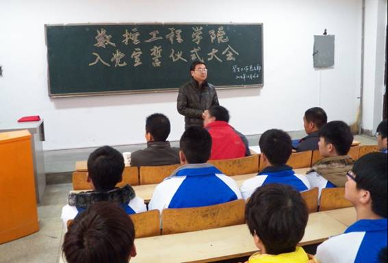 2014年12月26日下午,数控学院在笃学楼B二层阶梯教室隆重举行新党员入党宣誓仪式。数控学院党总支书记南欢、党委组织部组织干部科科长侯涛、数控学院学生工作党支部全体党员、入党积极分子代表共200余人参加了仪式。仪式由数控学院学生工作党支部书记王国柱主持。