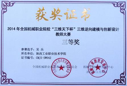 2014年11月10至14日,由全国机械职业教育教学指导委员会和机械工业教育发展中心主办的2014年全国机械职业院校“三维天下杯”三维逆向建模与创新设计教师大赛于天津机电职业技术学院成功举办,共有39所院校53名教师参赛,数控工程学院教师吴兵获得三等奖。