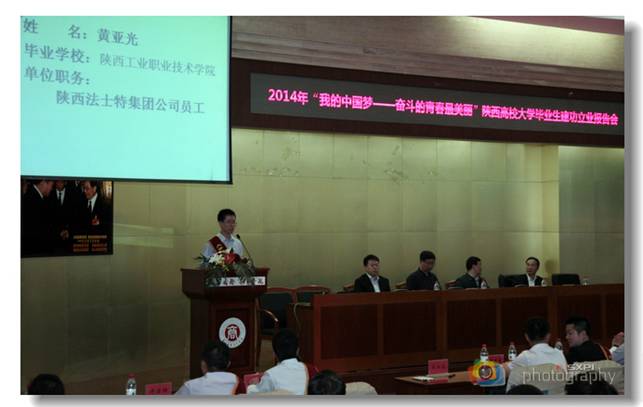 5月15日晚,由省委高教工委、省教育厅联合主办的2014年“我的中国梦——奋斗的青春最美丽”陕西高校大学毕业生建功立业先进事迹报告会在咸阳举行,我院数控技术专业2011届毕业生、法士特公司壳三车间加工中心操作兼调整工黄亚光与其他4名在不同岗位上做出突出成绩的先进典型一起,和青年学生分享了他们的成长历程。咸阳师范学院、陕西中医学院、咸阳职业技术学院、陕西国际商贸学院、西藏民族学院和我院等高校的300余名师生代表参加了报告会。
