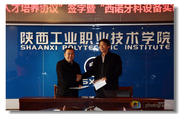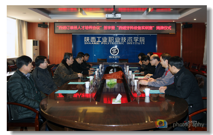 2014年1月2日下午,我院与西北医疗器械(集团)有限公司“西诺”订单班人才培养协议签字暨“西诺牙科设备实训室”揭牌仪式在崇文南楼第一会议室举行。西北医疗器械(集团)有限公司总经理李爱国、营销总监窦波、总经办主任聂西社、技术部副经理魏小峰、手机事业部制造部经理何林昌、总装车间主任刘登峰和我院院长崔岩、副院长王晓江、教务处、数控工程学院相关负责同志出席,王晓江副院长主持仪式。