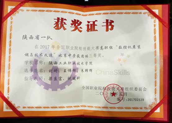 5月11日,2017年全国职业院校技能大赛高职组“数控机床装调与技术改造”赛项比赛在天津机电职业技术学院圆满结束,来自全国27个省市的48支代表队144名选手参加了比赛。经过2天的激烈角逐,由数控工程学院教师祝战科、梁盈富指导的数维1401班刘琦、数维1501班王伟锋、朱锋辉等3名同学组成的陕西一队荣获团体三等奖。