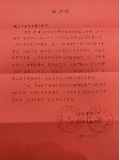 疫情发生以来,航空工程学院收到兴平市阜寨镇政府和汉台区东关街道办事处对我院机电1802班许豪同学、机电1907班李一哲同学的两封表扬信,信中分别对两名同学的疫情防控志愿服务工作进行了表扬与感谢(图3),同学们用实际行动诠释了报国为民的坚定信念,彰显了新时代青年的责任与担当,展现了陕西工院学子的青春风采。