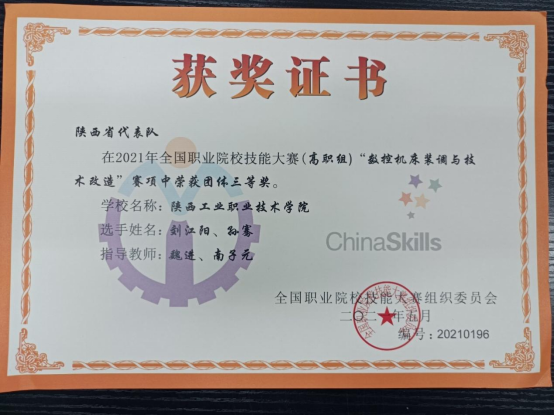 5月20-21日,2021年全国职业院校技能大赛高职组“数控机床装调与技术改造”赛项在山东省济南举行,共有来自全国27个省市自治区的代表队参加了本次比赛,我校由航空工程学院魏进、南子元两位老师指导的刘江阳、孙骞二位选手代表陕西省参赛。经过紧张激烈的角逐,最终荣获团体三等奖。