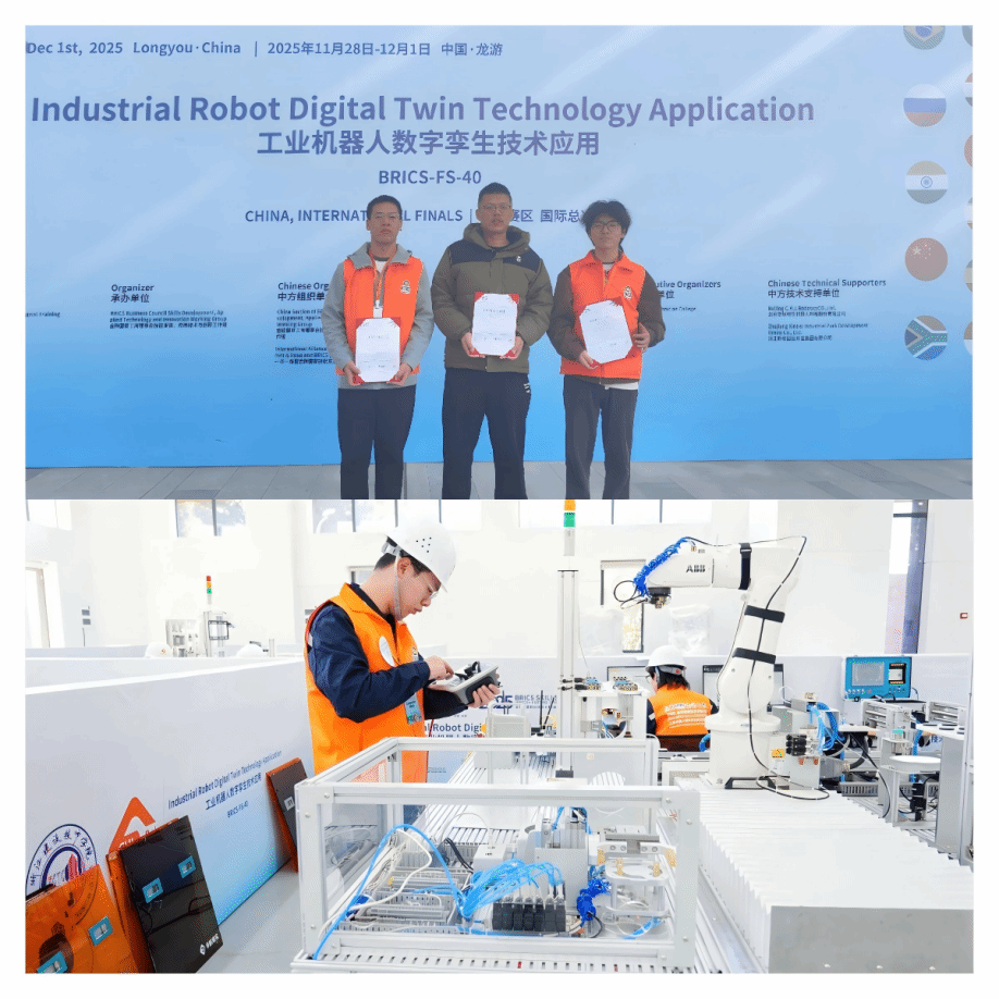 近日,2025年金砖国家职业技能大赛国际总决赛工业机器人数字孪生技术应用赛项于浙江成功举办,中国赛区共50余所高校的选手同台竞技,我校航空工程学院教师张育洋、曹京年指导的机电一体化技术专业学生杜金峰、蔺浩然凭借扎实的技术功底,沉稳应对复杂赛题,历经6小时的高强度竞技,最终喜获二等奖,充分展现了我校学子精湛的技术素养与拼搏奋进的职业风貌。